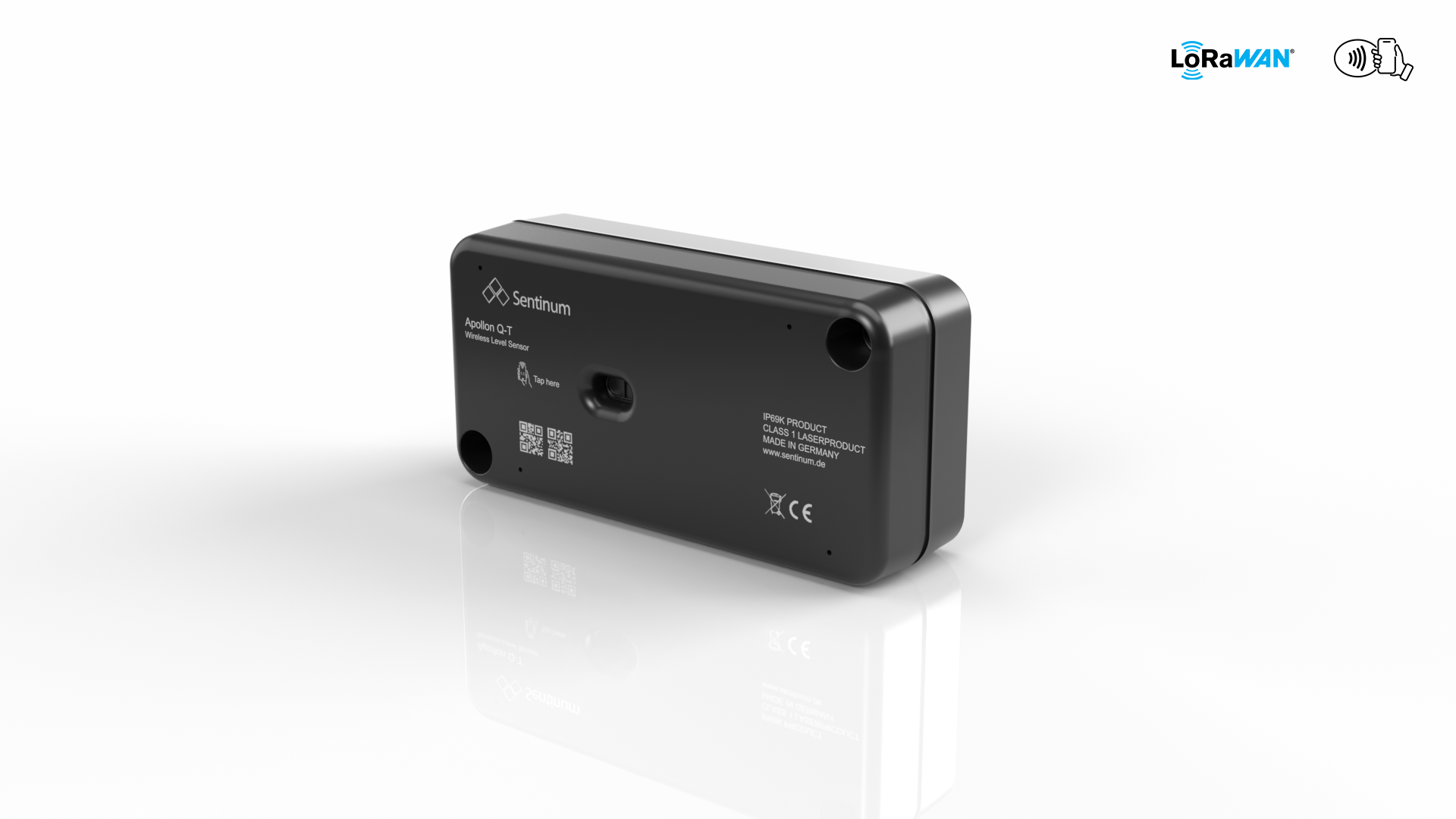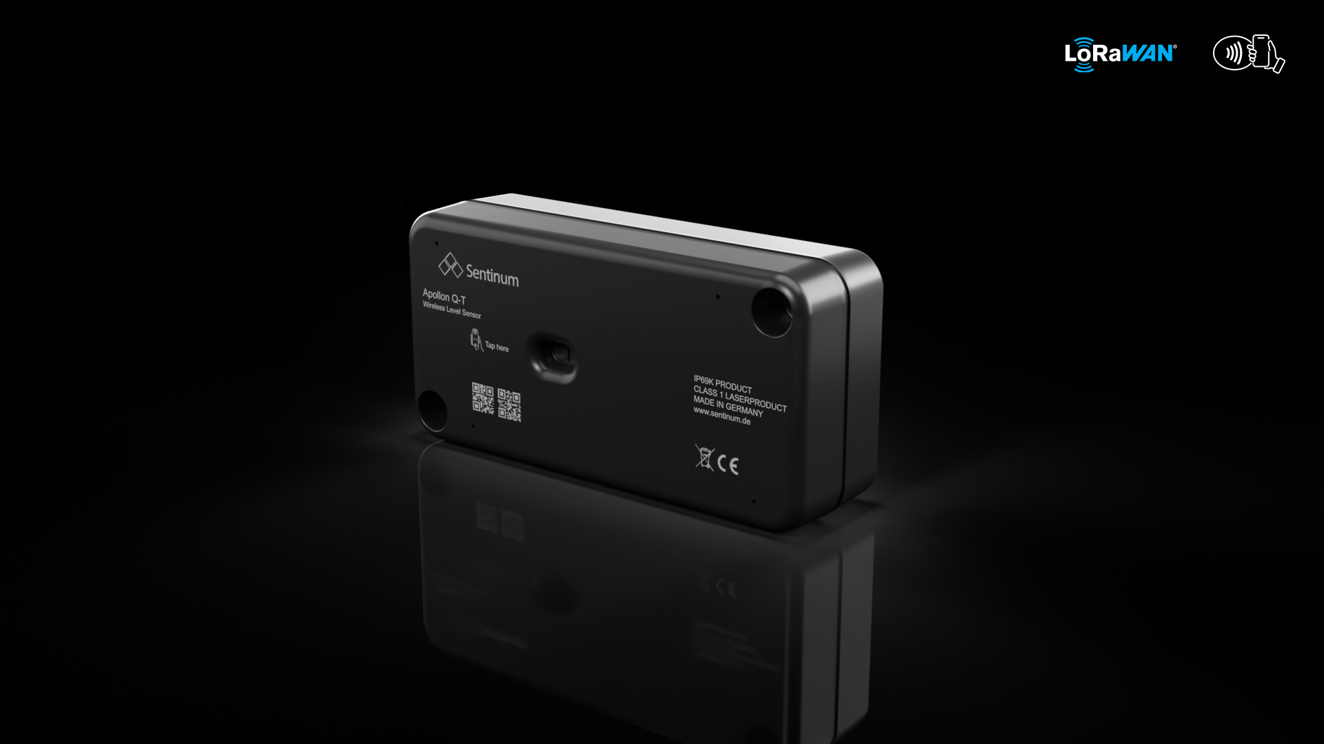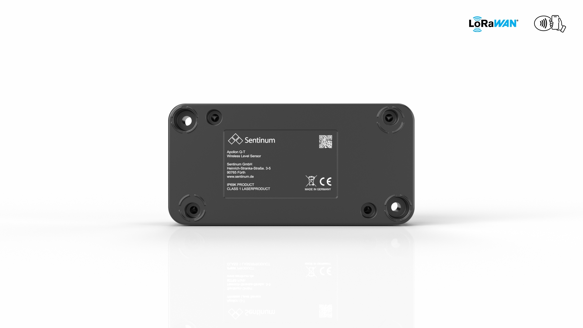 Sentinum Apollon-Q standard performance, drahtloser LoRaWAN® Mehrzweck Füllstand- und Distanzsensor, Laser ToF Sensortechnologie, IP69k, 2k-Dichtung, -30°C bis 75°C, konfigurierbar über NFC, wechselbare Batterie.Eigenschaften