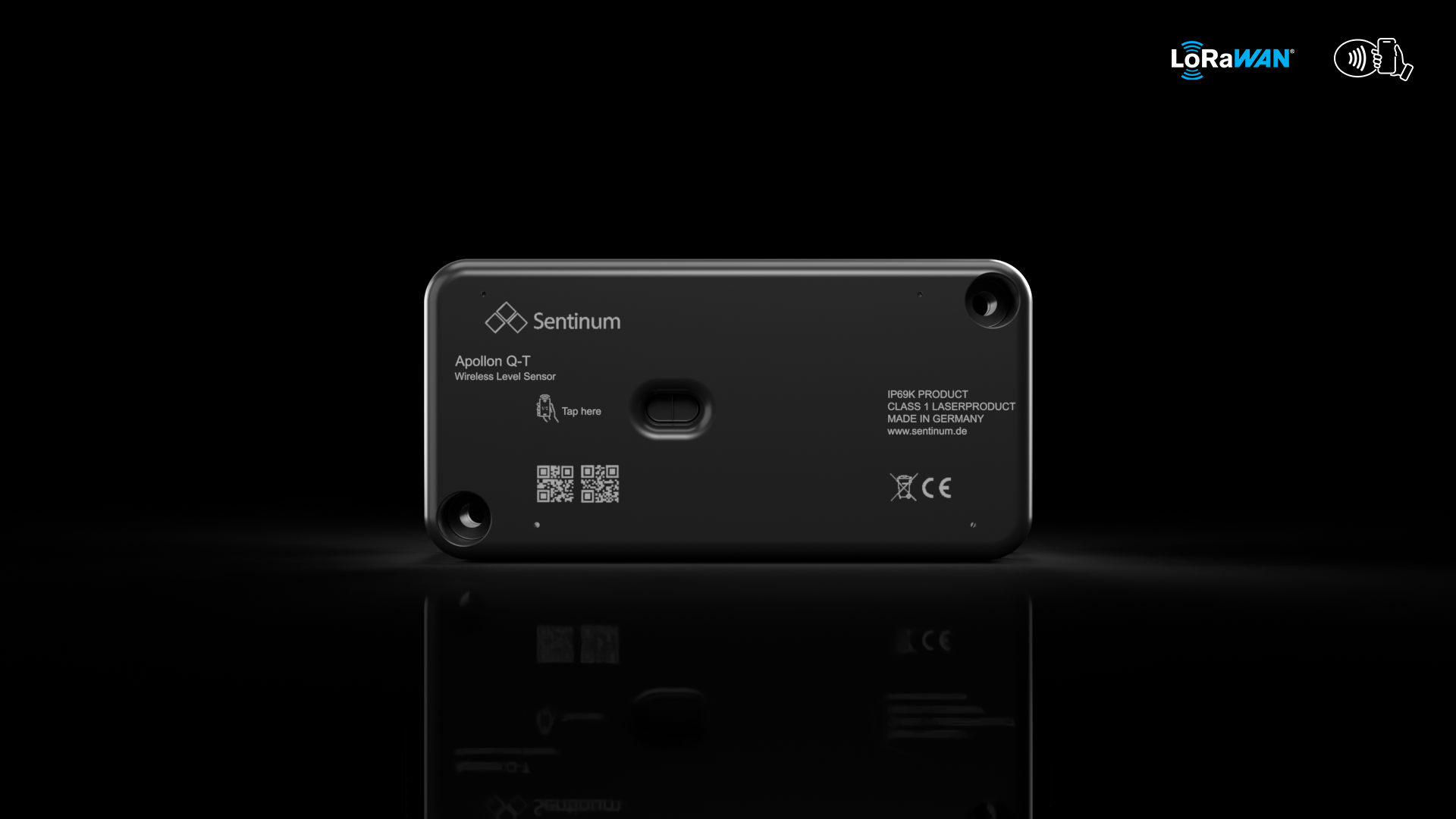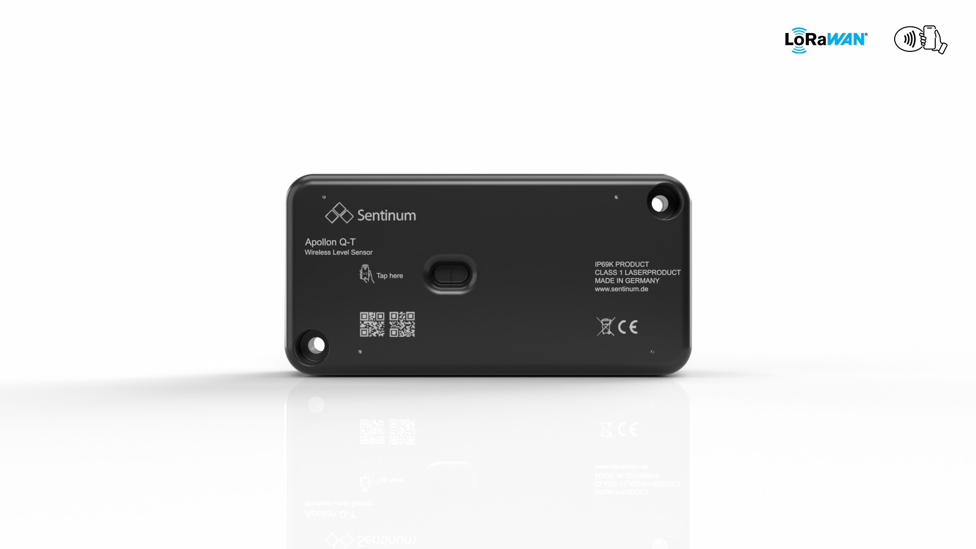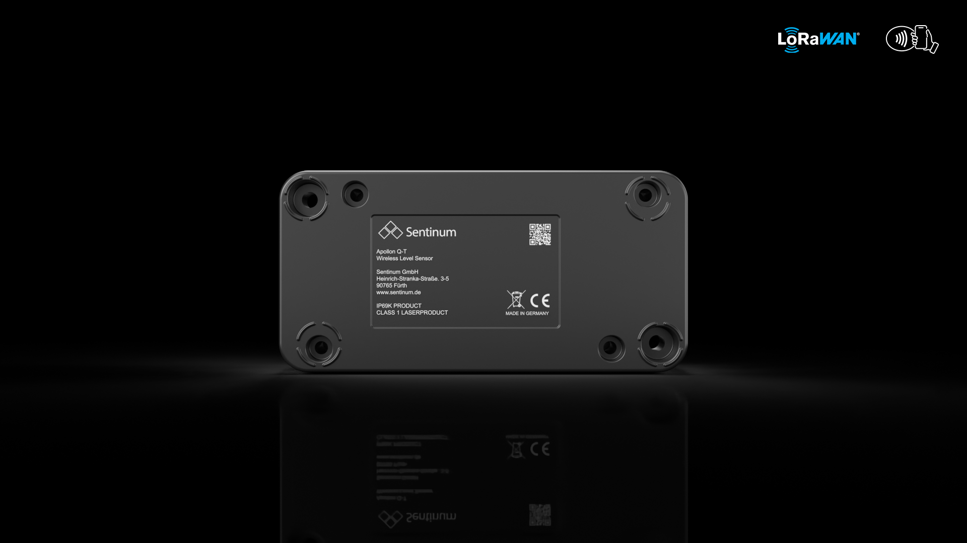 Sentinum Apollon-Q standard performance, drahtloser LoRaWAN® Mehrzweck Füllstand- und Distanzsensor, Laser ToF Sensortechnologie, IP69k, 2k-Dichtung, -30°C bis 75°C, konfigurierbar über NFC, wechselbare Batterie.Eigenschaften