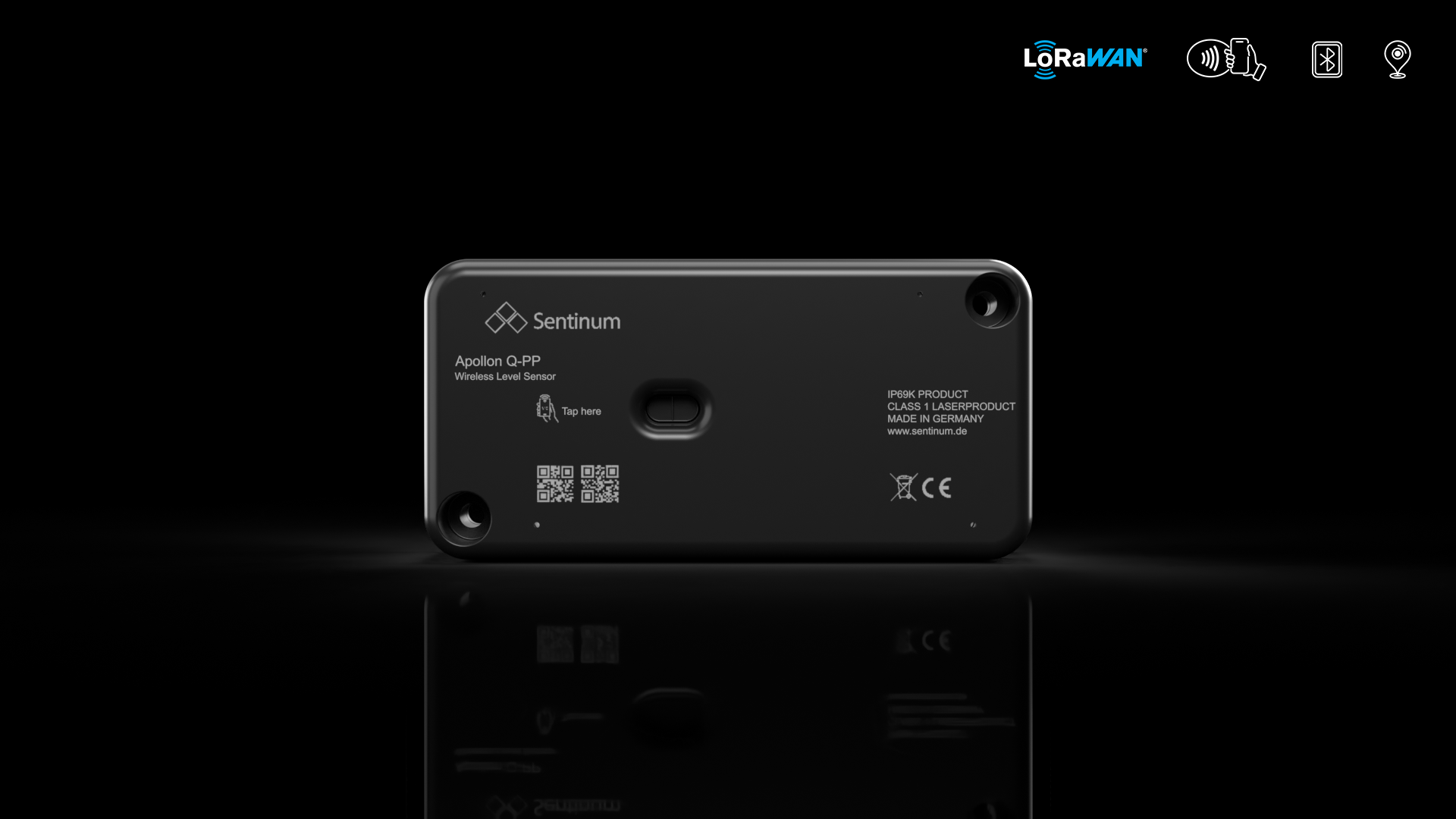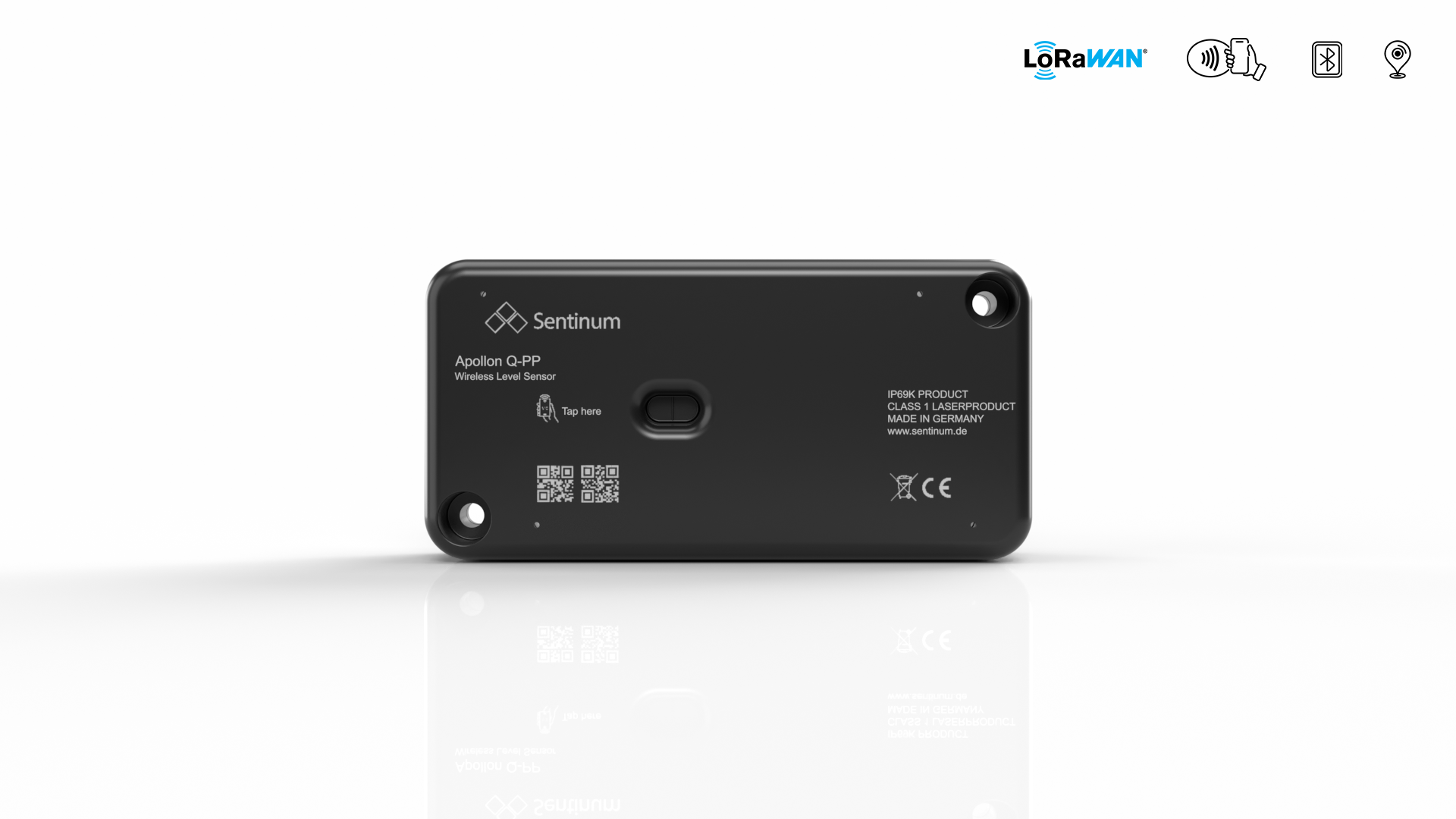 Sentinum Apollon-Q, industrieller drahtloser LoRaWAN® Mehrzweck Vierstufen Präsenzdetektor für Logistik Anwendungen, IP69k, 2k-Dichtung, -30°C bis 75°C, konfigurierbar über NFC und BLE, Accelerometer für Öffnungs- und Vandalismusdetektion, wechselbare Batterie.Eigenschaften