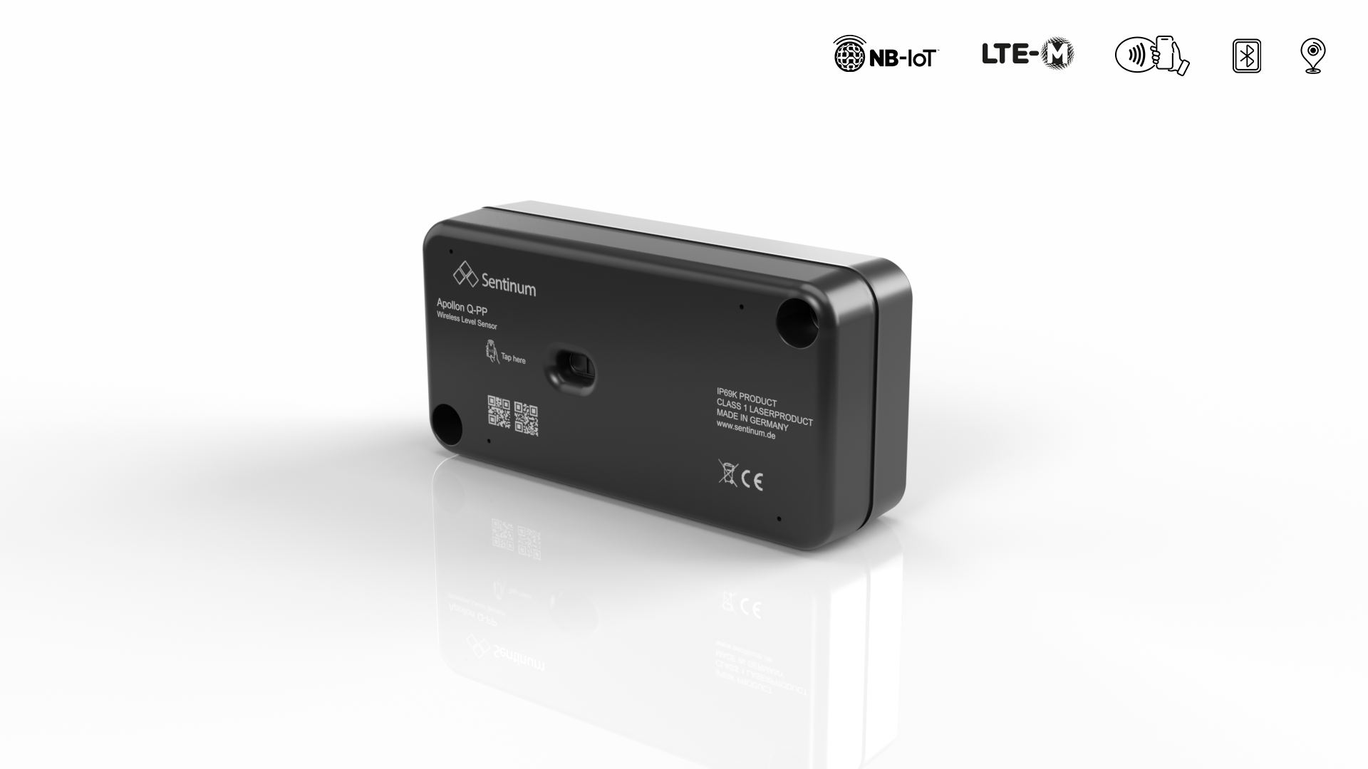 Sentinum Apollon-Q, industrieller drahtloser NB-IoT, LTE-CAT-M1 Mehrzweck Vierstufen Präsenzdetektor für Logistik Anwendungen, IP69k, 2k-Dichtung, -30°C bis 75°C, konfigurierbar über NFC und BLE, Lokalisierung über GNSS, Accelerometer für Öffnungs- und Vandalismusdetektion, wechselbare Batterie.Eigenschaften