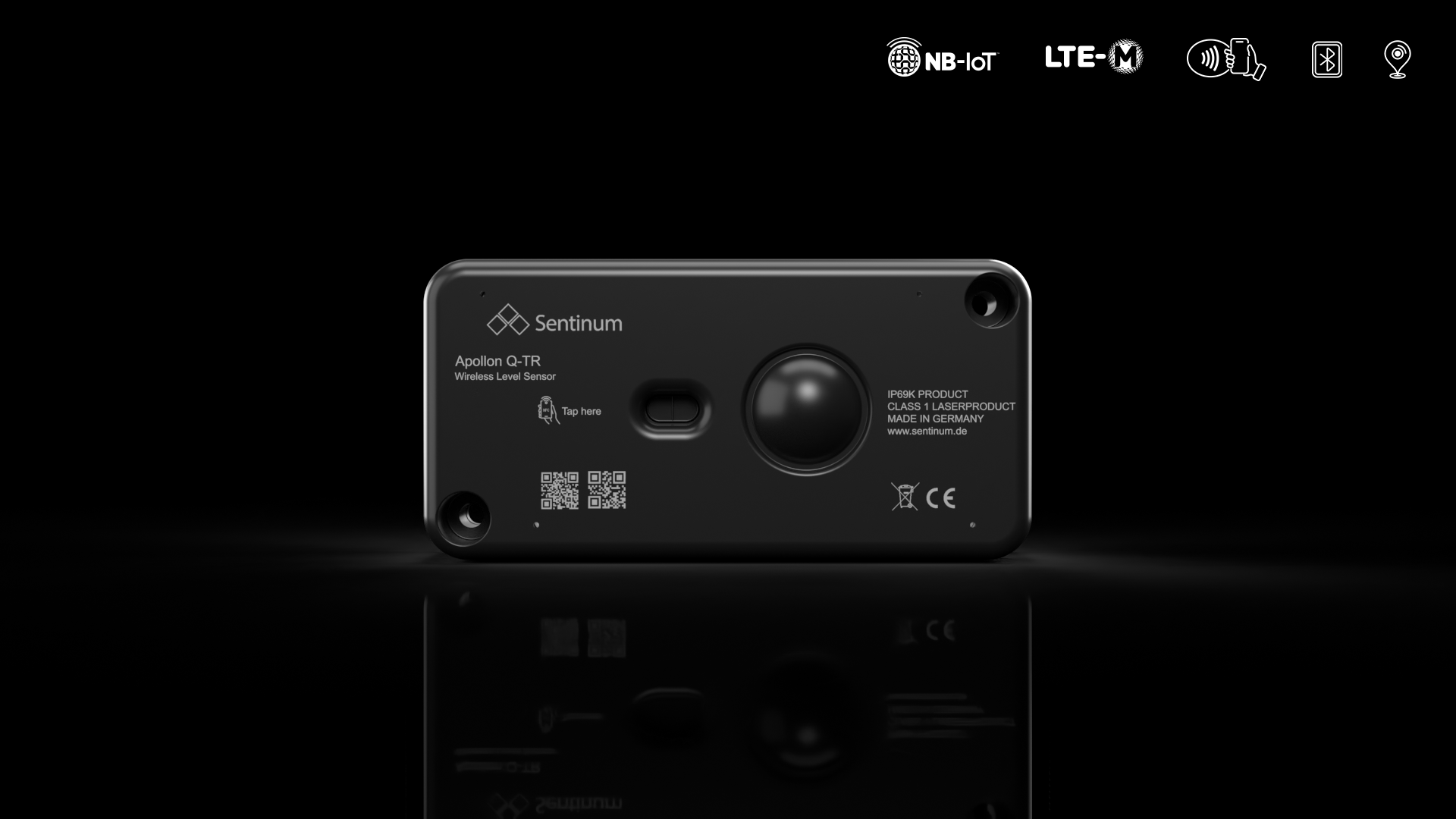 Sentinum Apollon-Q, drahtloser NB-IoT, LTE-CAT-M1, GNSS, Smart Waste Füllstand- und Distanzsensor, OPTIMIERTE SMART WASTE SOFTWARE, duales Messprinzip mit Radar für schwache Reflektoren und Laser ToF Sensortechnologie mit Multitarget Erfassung, Beschleunigungssensor für Vandalismus- und Öffnungsdetektion, IP69k, 2k-Dichtung, -30°C bis 75°C, konfigurierbar über NFC, wechselbare Batterie.Optimierter Sensor für Smart Waste