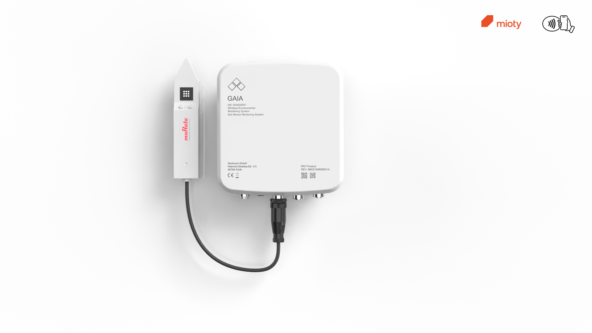 Sentinum GAIA mioty®, drahtloser Mehrzweck Sensor für Umweltmonitoring ausgestattet mit einem Bodensensor, Bodenfeuchte, Bodentemperatur, elektrische Leitfähigkeit, Bulk und Pore EC, IP68, Dimensionen 132,5mmx27mmx16,2mm, Kabellänge 2 Meter, Betriebstemperatur -20°C bis 70°C, M12 industrielle Steckerverbinder, IP67, Gehäuse ASA, Konfiguration über NFC, Batterien 4xAA oder 2xC Zellen. Lieferumfang: Gaia Smart Box, Bodensensor, Anschlusskabel, Batterien.Eigenschaften