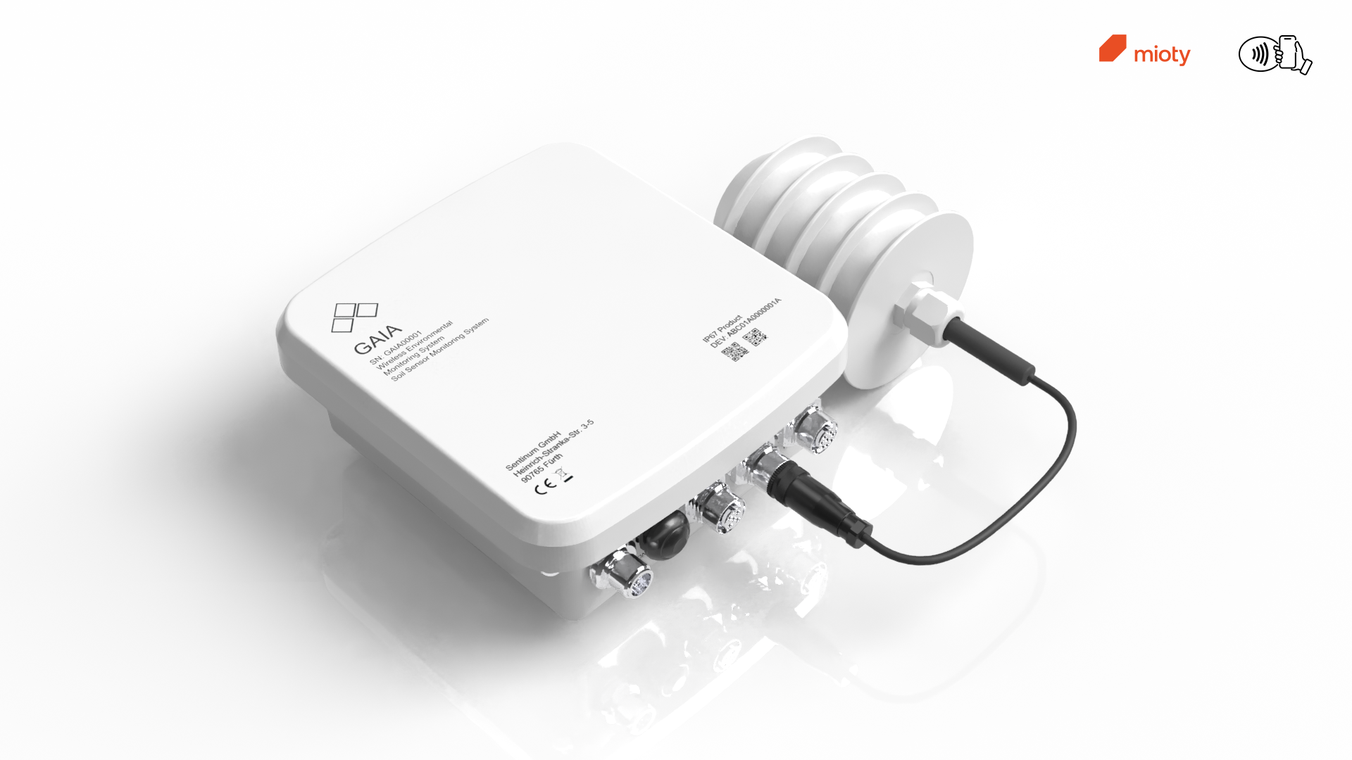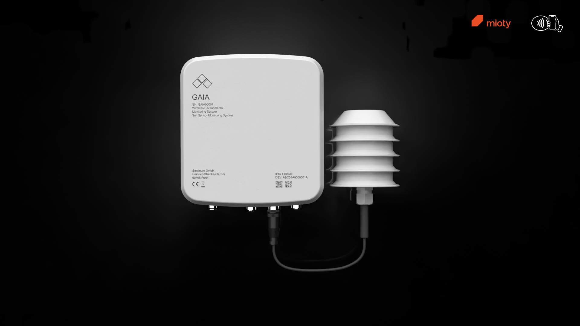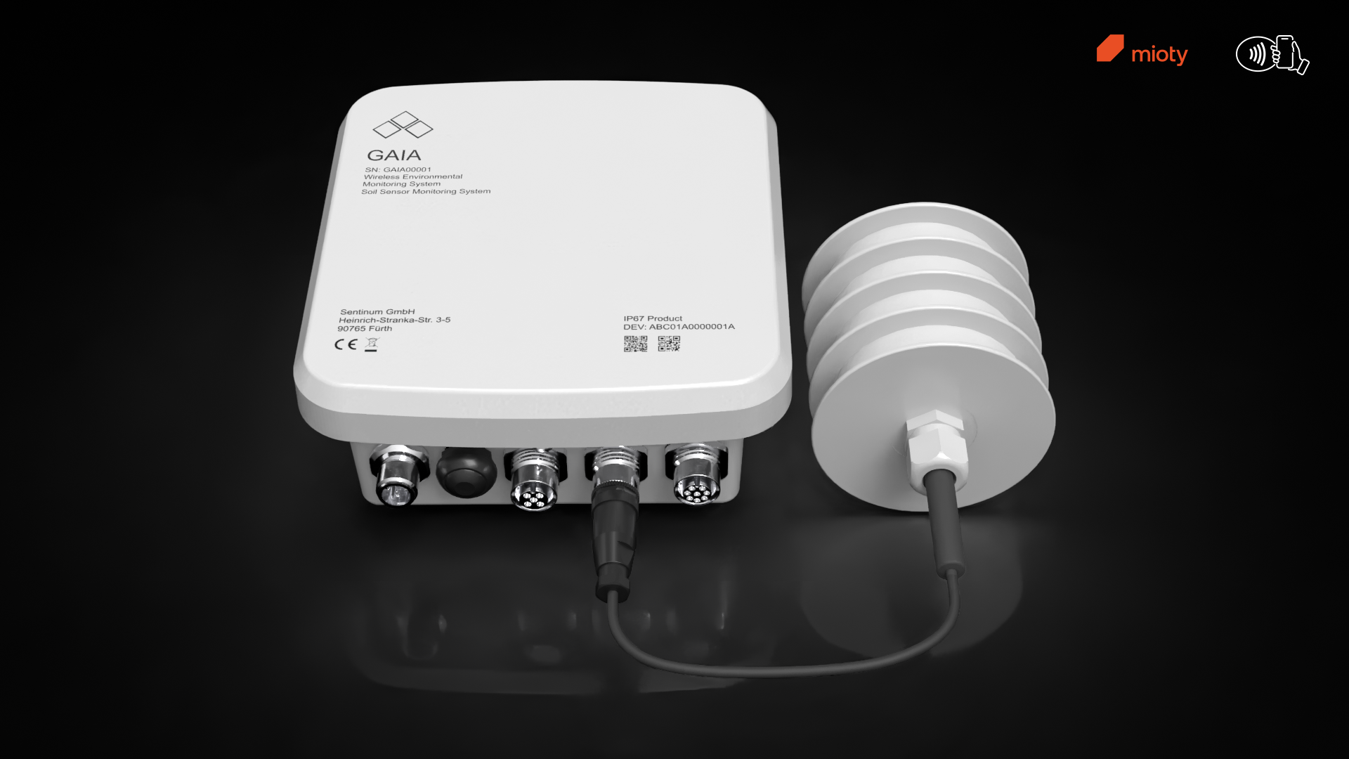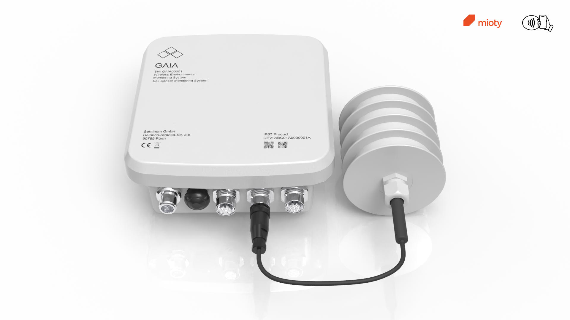 Sentinum Gaia mioty®, drahtloser Mehrzweck Sensor für Umweltmonitoring ausgestattet mit einer Wetterstation mit Strahlungsschutz für die Messung von Temperatur, rel. Luftfeuchtigkeit, Taupunkt, Kalibrierzertifikat auf Anfrage, Kabellänge ca. 1,50m, M12 industrielle Steckerverbinder, IP67, Gehäuse ASA, Konfiguration über NFC, Batterien 4xAA oder 2xC Zellen. Lieferumfang: Gaia Smart Box, Wetterstation, Anschlusskabel, Batterien.