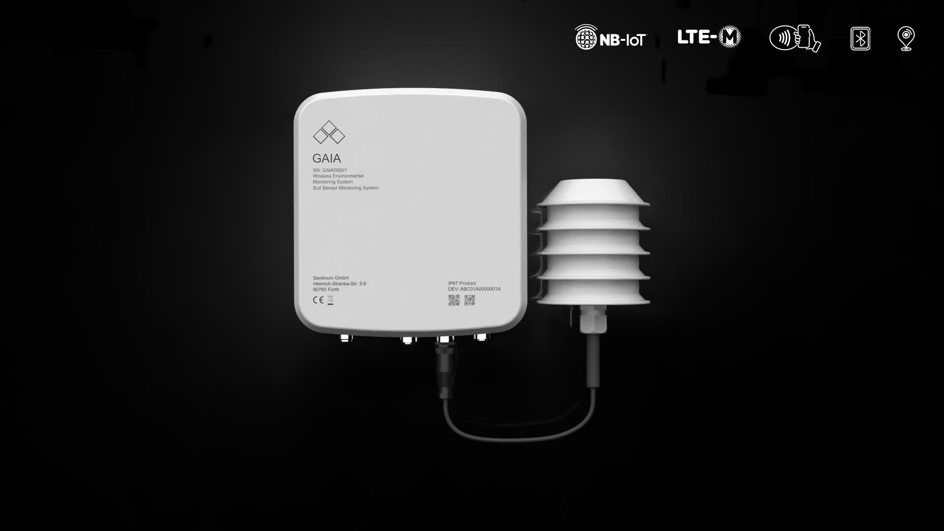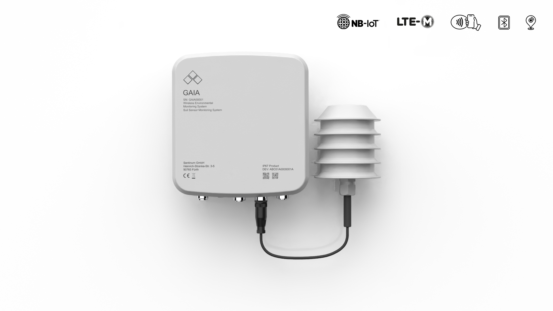 Sentinum Gaia NB-IoT, LTE-CAT-M1, GNSS, drahtloser Mehrzweck Sensor für Umweltmonitoring ausgestattet mit einer Wetterstation mit Strahlungsschutz für die Messung von Temperatur, rel. Luftfeuchtigkeit, Taupunkt, Kalibrierzertifikat auf Anfrage, Kabellänge ca. 1,50m, M12 industrielle Steckerverbinder, IP67, Gehäuse ASA, Konfiguration über NFC, Batterien 4xAA oder 2xC Zellen, ohne SIM Karte und Webplattform. Lieferumfang: Gaia Smart Box, Wetterstation, Anschlusskabel, Batterien.Eigenschaften