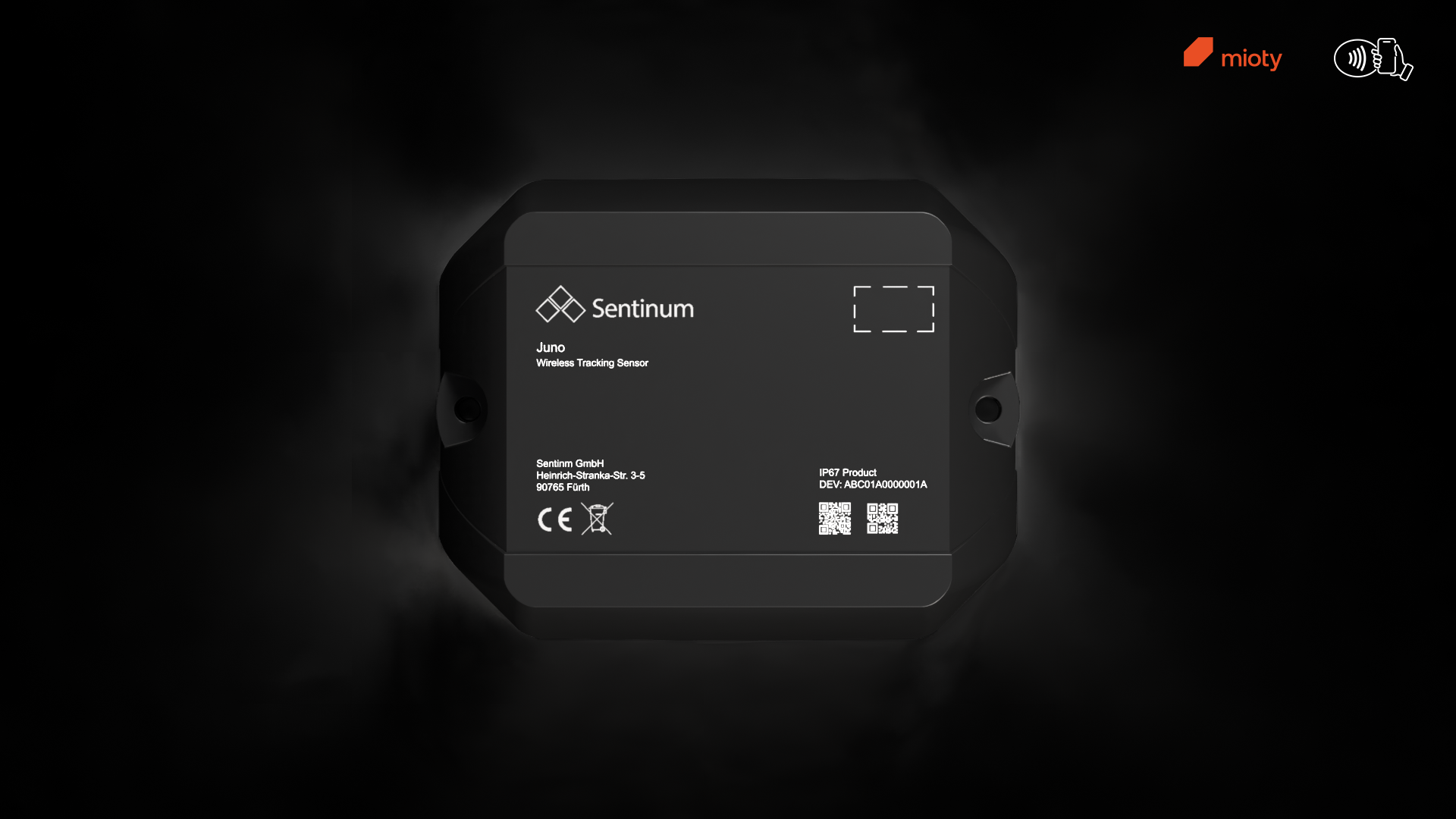 Sentinum Juno ID und Neigungssensor (Tilt), drahtloser mioty® easy Tracker ohne GNSS, Lokalisierung über Netzwerk, IP67, -30°C bis 75°C, konfigurierbar über NFC, Accelerometer für Öffnungs- und Vandalismusdetektion, wechselbare Batterie 2xAA Zellen.Eigenschaften