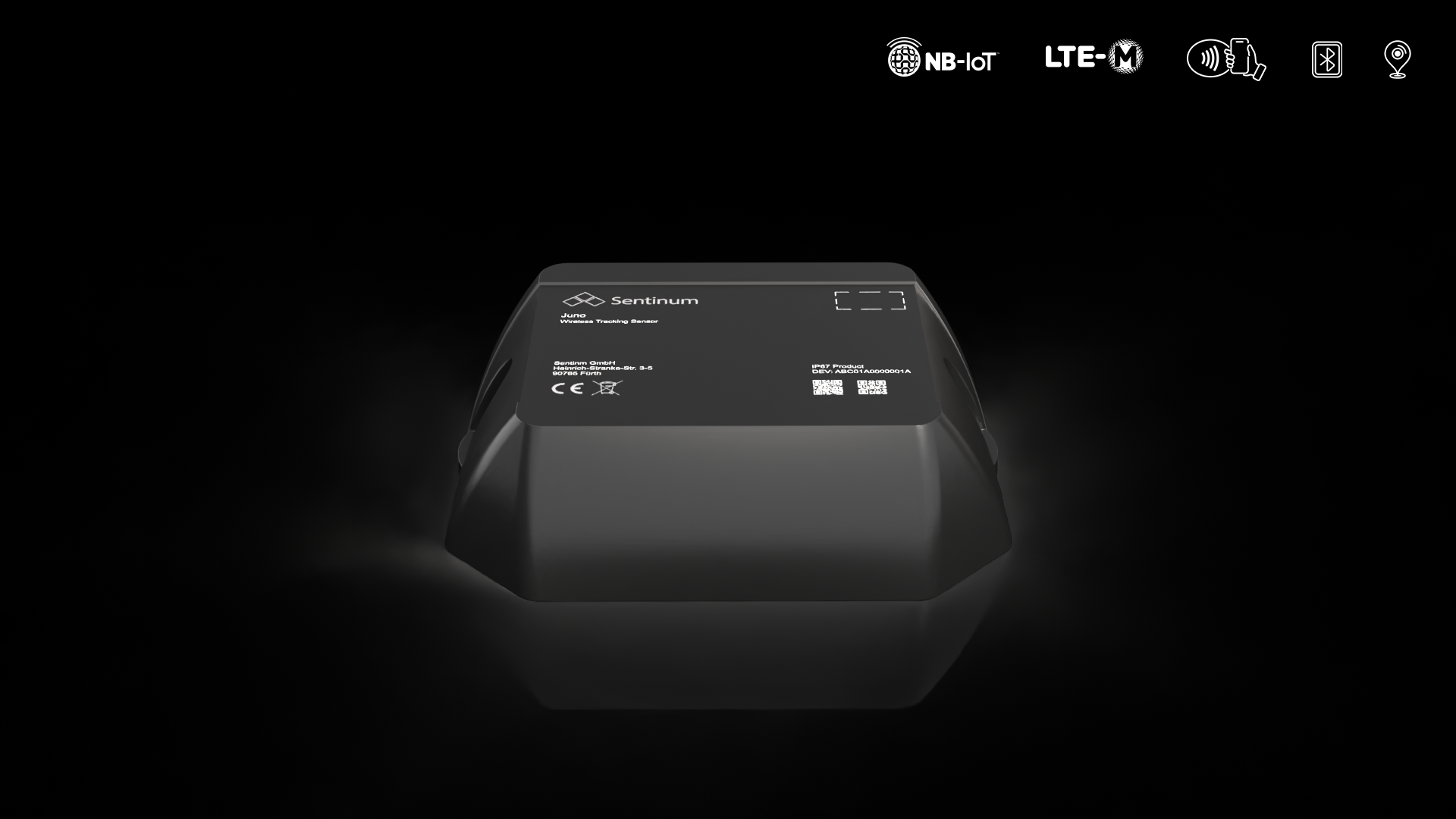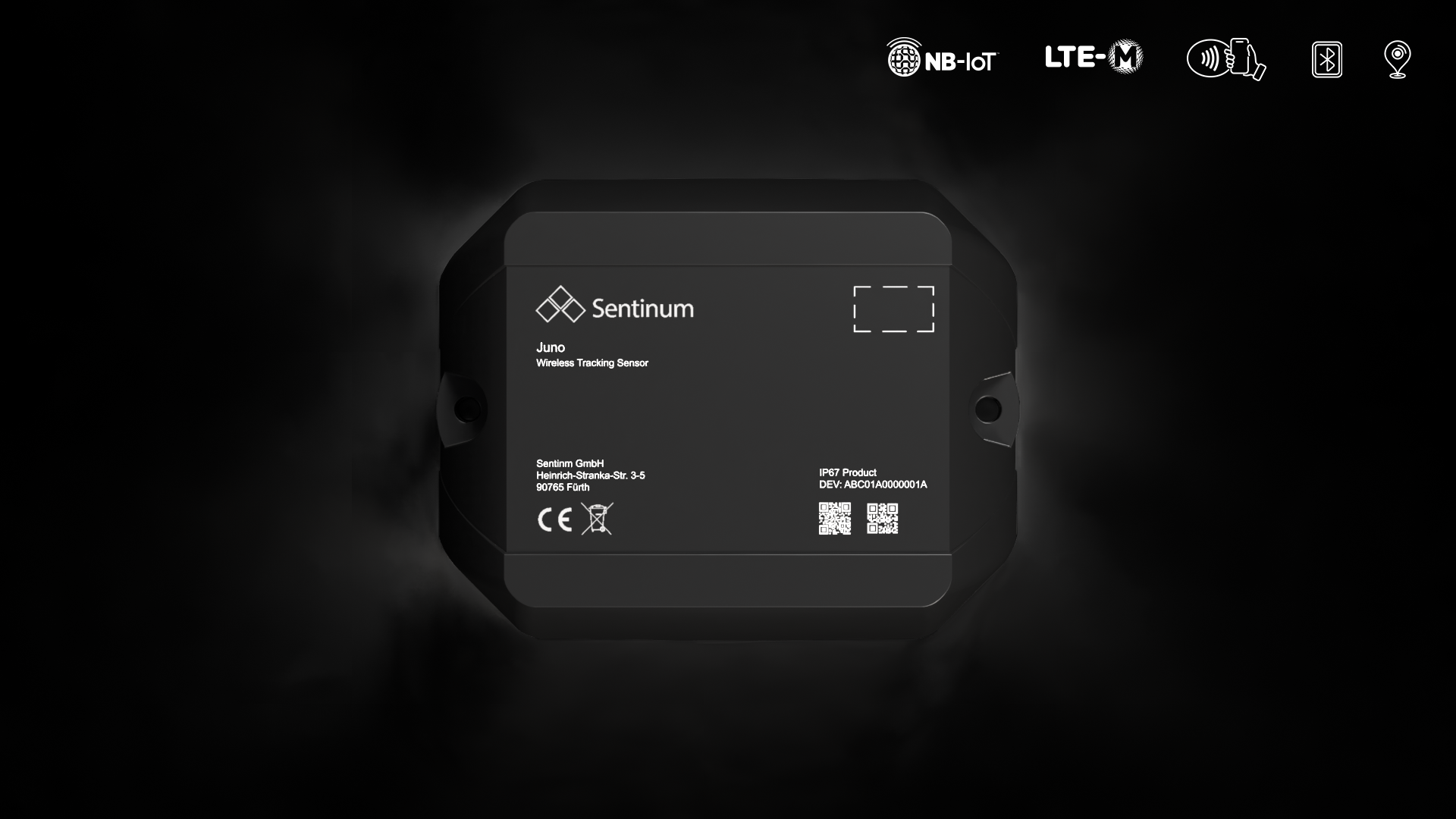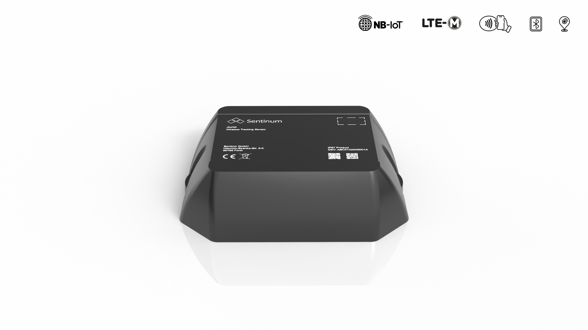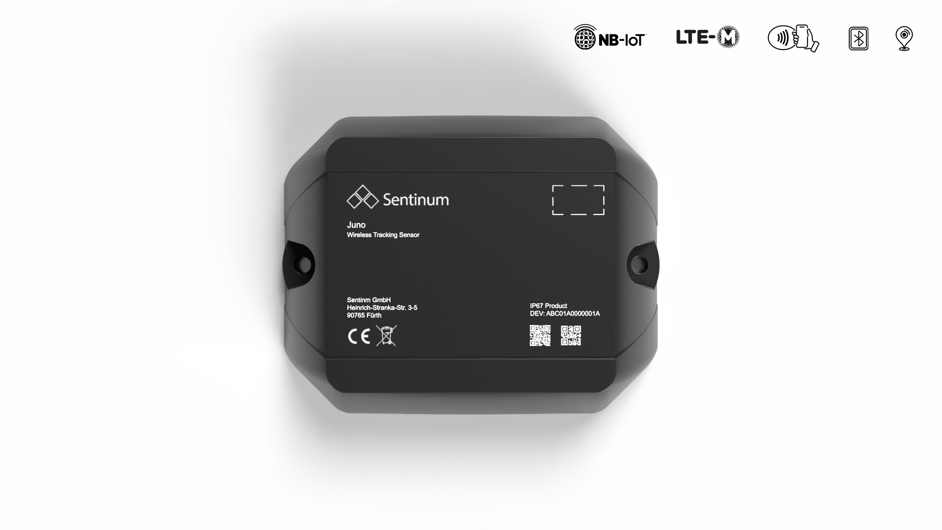 Sentinum Juno GNSS Tracker, drahtloser NB-IoT, LTE-CAT-M1, GNSS Tracker, Lokalisierung über GNSS oder WIFI Scan, IP67, -30°C bis 75°C, konfigurierbar über NFC und BLE, Accelerometer für unterschiedliche Tracking und Übertragungsmodi, wechselbare Batterie, ohne SIM Karte, mit SIM Karten Slot.Eigenschaften